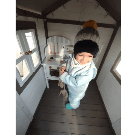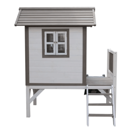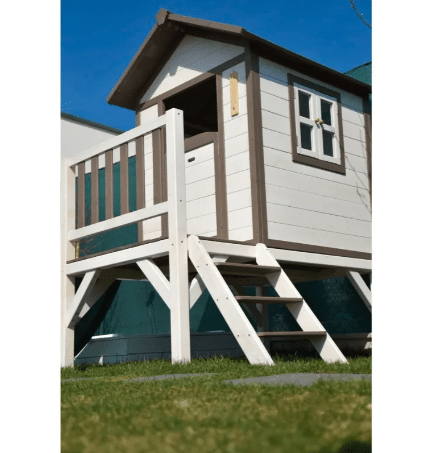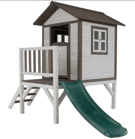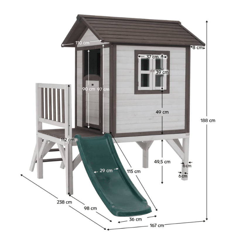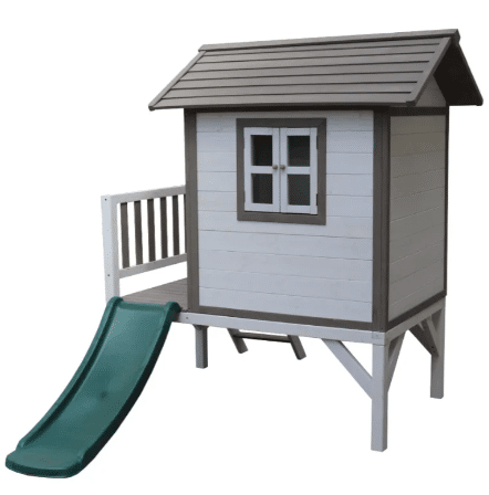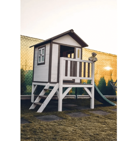 בית משחק מעץ מלא, עם מגלשה, מדרגות ומרפסת מגודרת – כל מה שילד צריך כדי להפוך כל יום לחגיגה.