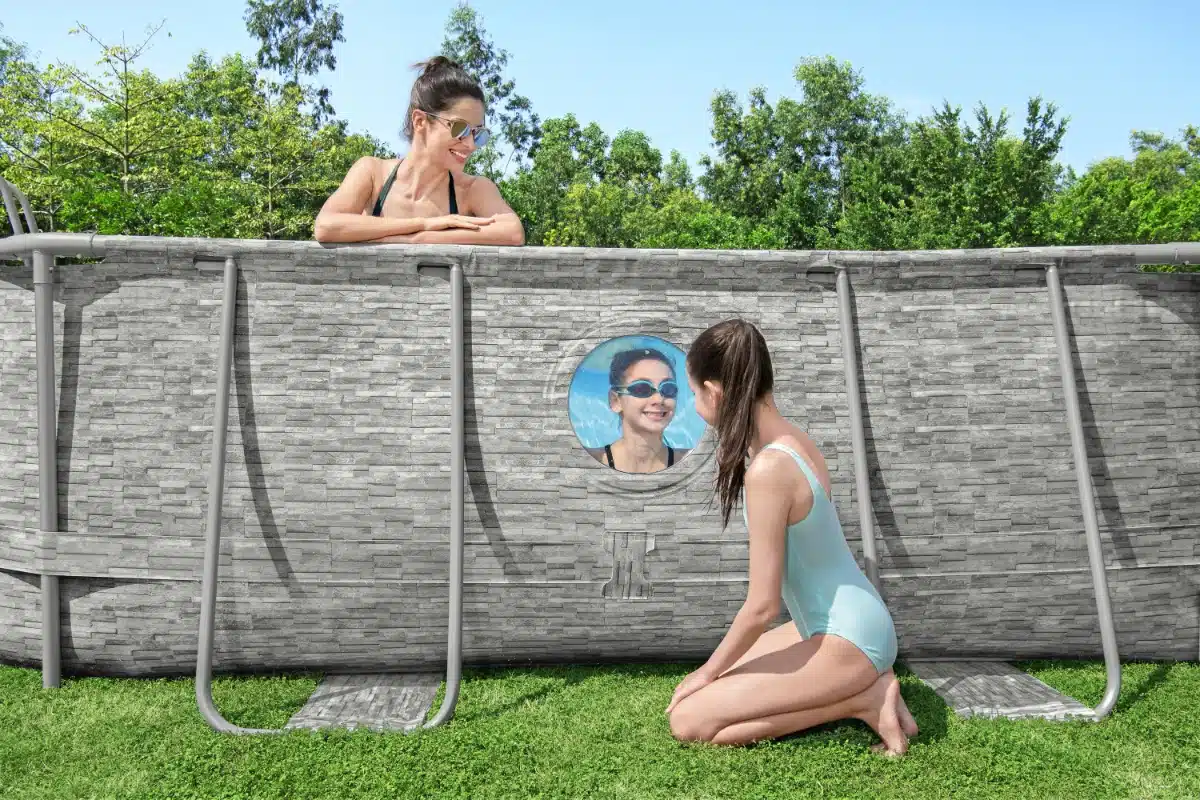 עם עיצוב דמוי עץ, 4 חלונות שקופים, משאבת חול עוצמתית, סולם בטיחותי וכיסוי תואם – הבריכה הזו מציעה את השדרוג האולטימטיבי לגינה הביתית!