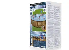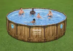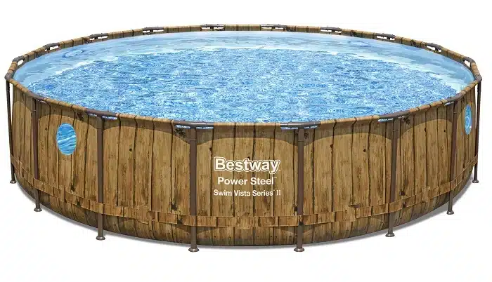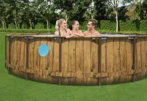 בריכה עגולה בעיצוב דמוי עץ יוקרתי מבית BESTWAY, עם 4 חלונות שקופים קבועים – מושלמת לבילוי משפחתי, צינון והנאה ביום חם, בקלות ובסטייל.