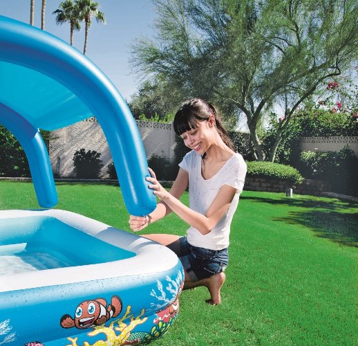 עם הבריכה המתנפחת מבית Bestway, הילדים שלכם ייהנו משעות של הנאה ושמחה, בשילוב עיצוב אקווריום צבעוני וגגון מובנה להגנה מפני השמש!